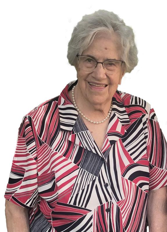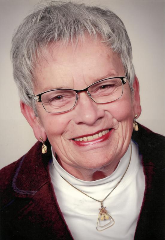 Porträt einer älteren Frau mit blonden Haaren, die ein gemustertes Hemd trägt, vor einer hellen Hintergrundfläche.