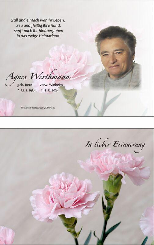Traueranzeige für Agnes Werthmann mit einem Porträtfoto und Blumenmotiven, Daten zur Beerdigung und persönlichen Erinnerungen.