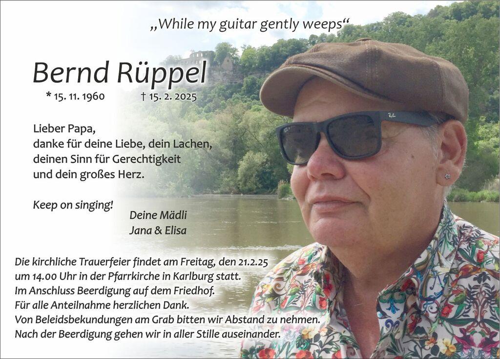 Trauerkarte mit Foto von Bernd Rüppel, persönlichen Erinnerungen und Angaben zur Trauerfeier am 21. Februar 2025.