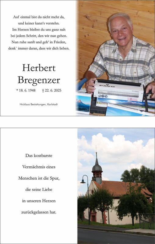 Gedenkblatt für Herbert Bregenzer mit persönlichen Daten, Trauerspruch und Beerdigungsdetails, umgeben von Naturbildern.