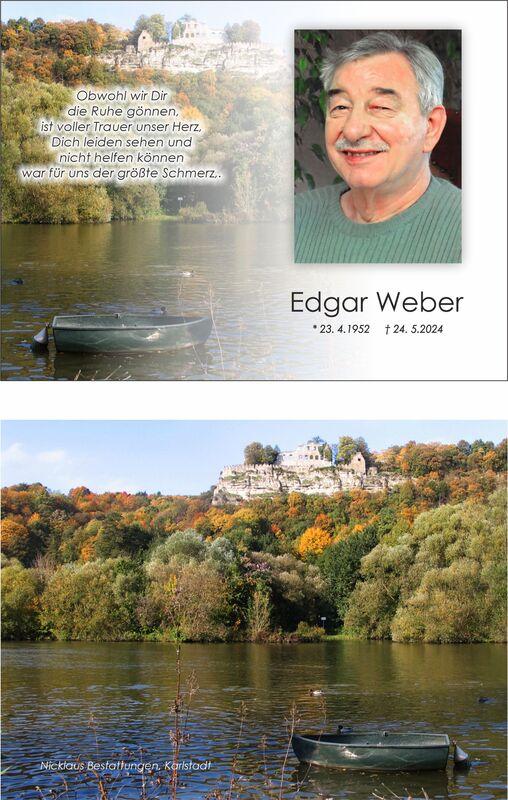 Sterbebild für Edgar Weber mit Foto, Geburts- und Sterbedatum sowie Trauermitteilung und Details zur Trauerfeier.