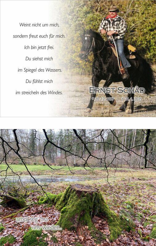 Reiter auf schwarzem Pferd in der Natur, Umrahmung mit Gedicht und Namen auf einem Gedenkblatt.