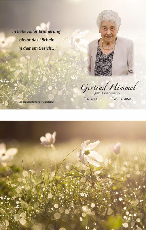 Portrait von Gertrud Himmel vor einem verschwommenen, blühenden Hintergrund mit Traueranzeige und Angaben zum Gottesdienst.