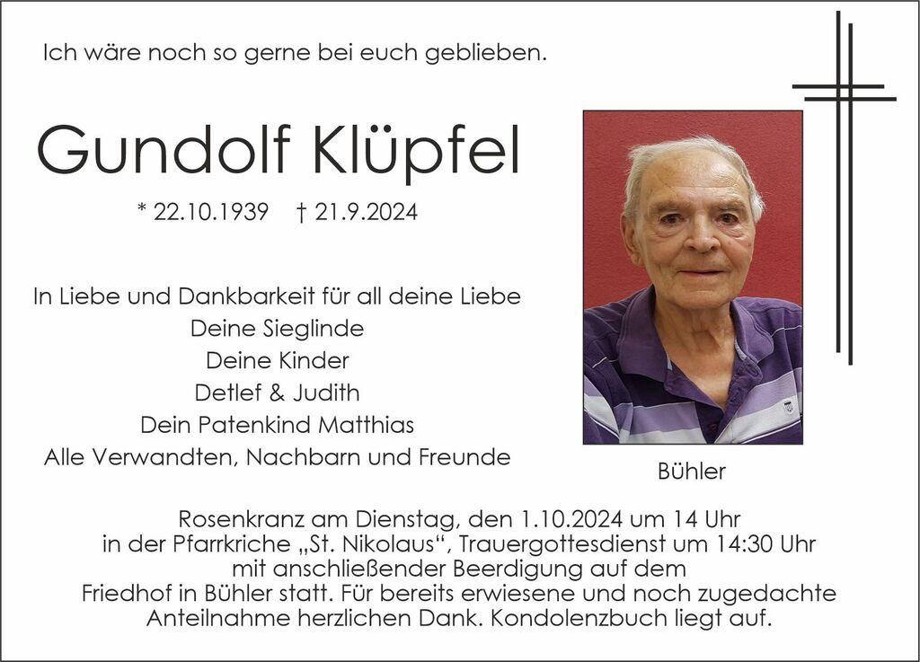 Trauerrubrik mit Bild von Gundolf Klüpfel, Geburts- und Sterbedatum sowie Angaben zur Trauerfeier.