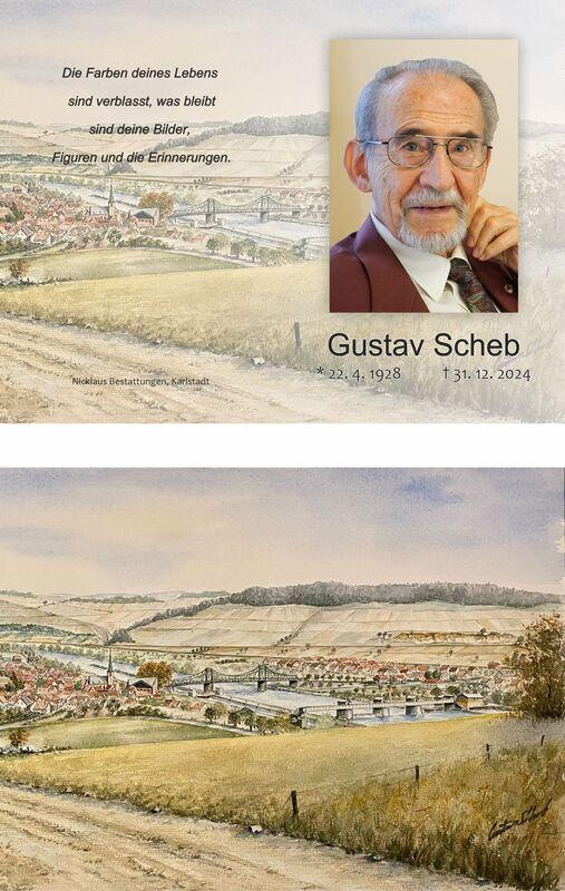 Traueranzeige für Gustav Scheb mit Geburts- und Todesdatum, einem Bild von ihm und einer Illustration der Landschaft im Hintergrund.