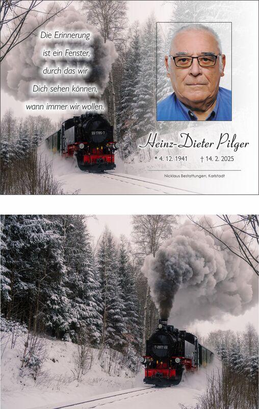 Trauerkarte mit Foto von Heinz-Dieter Pilger, Geburts- und Sterbedaten, sowie Erinnerungen von Angehörigen.