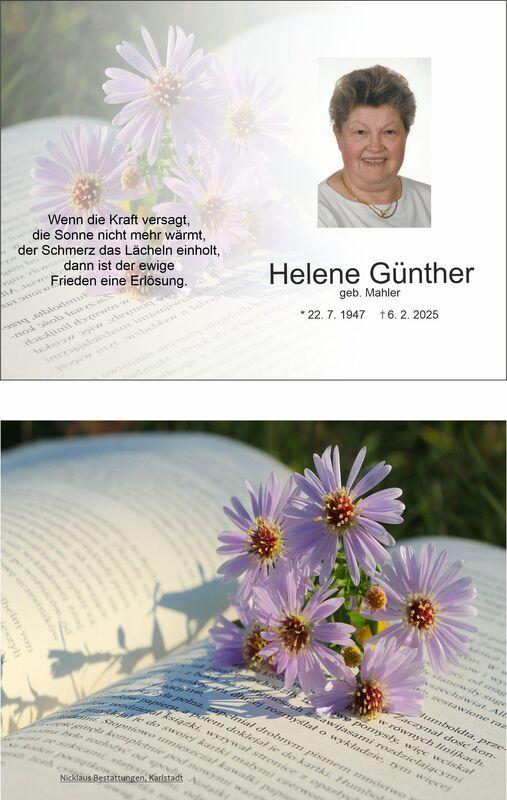 Foto einer Frau mit hellem Lächeln, umgeben von Blumen und Text, in Erinnerung an Helene Günther.