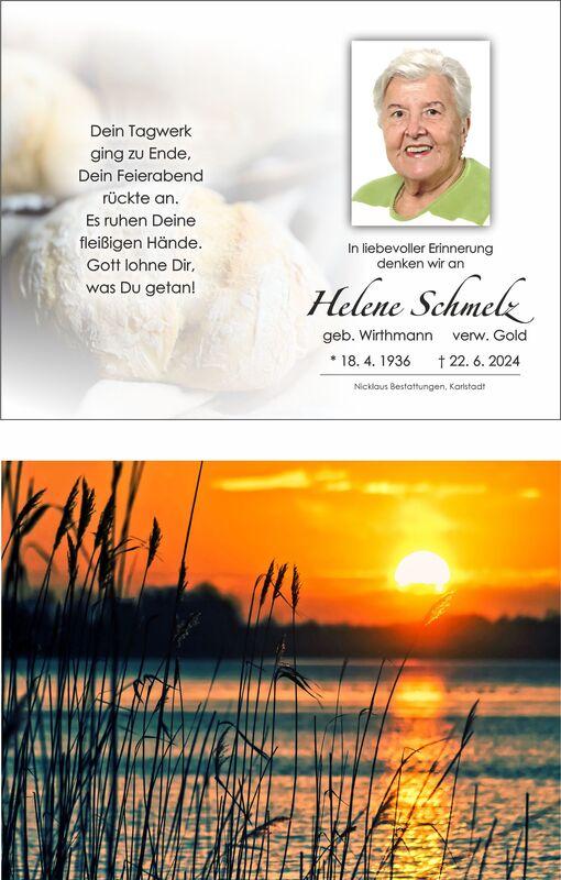 Traueranzeige für Helene Schmelz mit Bild und Erinnerungstext. Daten zur Urnenbeisetzung sind aufgeführt.