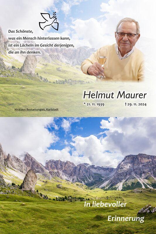 Bild mit Text zum Gedenken an Helmut Maurer, einschließlich einer Naturkulisse mit Bergen und Wiese.