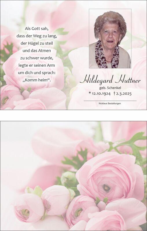 Traueranzeige für Hildegard Huttner mit Porträt und floralen Hintergründen, inklusive Geburts- und Sterbedatum.