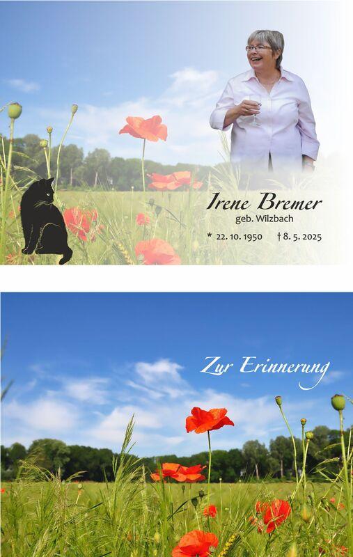 Traueranzeige für Irene Bremer mit Geburts- und Sterbedaten sowie Erinnerungen von Angehörigen, Blumenmotiv im Hintergrund.