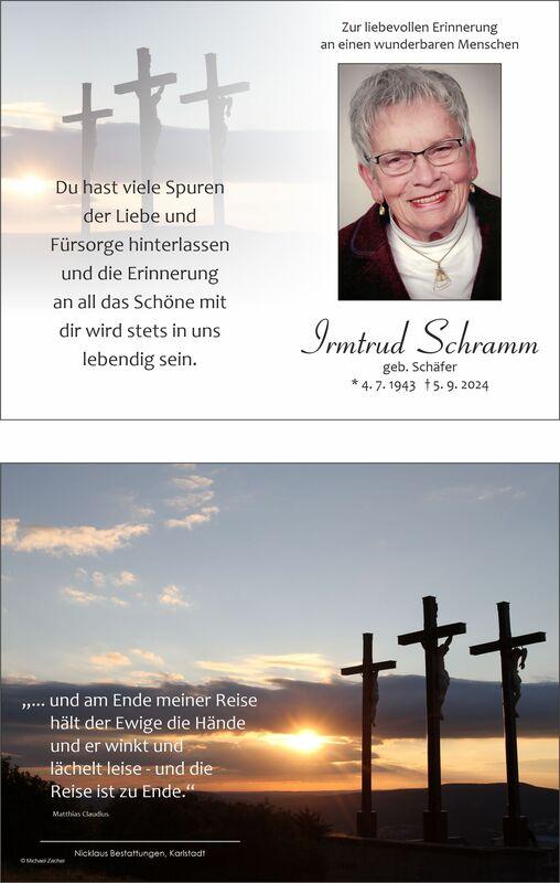 Traueranzeige für Irmtrud Schramm mit Foto, Lebensdaten und Informationen zur Trauerfeier in Heinrichsthal.