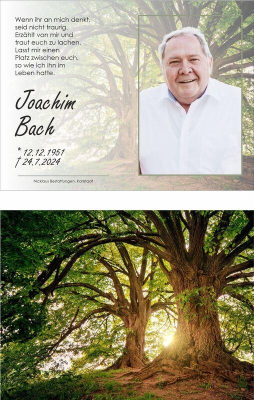 Abschiedskarte für Joachim Bach mit Foto und Trauermitteilung, umgeben von einem lichten Baumhintergrund.