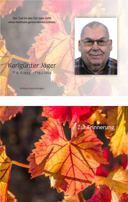 Gedenkarten-Design mit Foto von Karlgünter Jäger, Namen, Lebensdaten und bunten Herbstblättern im Hintergrund.