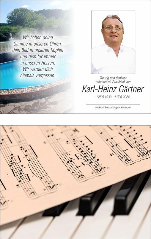 Abbildungsbeschreibung: Traueranzeige für Karl-Heinz Gärtner mit Angaben zur Trauerfeier und einem Porträtfoto an einem Swimmingpool.