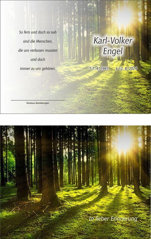 Trauerkarte mit Waldmotiv,Inschrift „In lieber Erinnerung“ und Daten zu Karl-Volker Engel auf hellem Hintergrund.