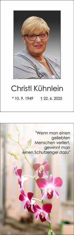 Traueranzeige für Christl Kühnlein mit Foto, Geburts- und Sterbedatum sowie Informationen zur Urnenbeisetzung in Karlstadt.