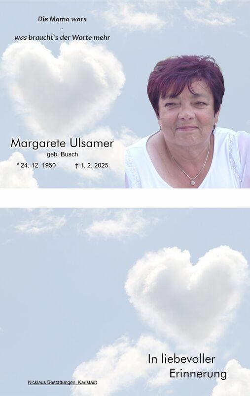 Traueranzeige für Margarete Ulsamer: Geburtsdatum 24.12.1950, Sterbedatum 1.2.2025, Requiem in Gössenheim.