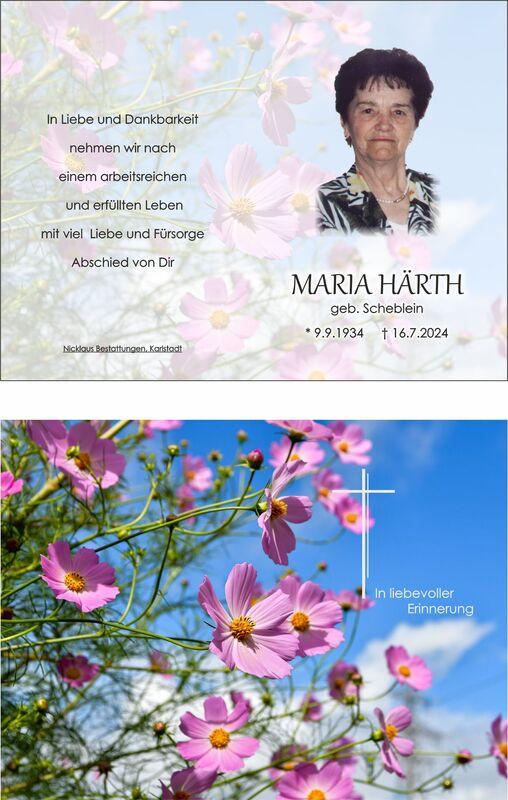 Gedenkblatt für Maria Härth mit Blumendekor und persönlichen Daten in sanften Farben.