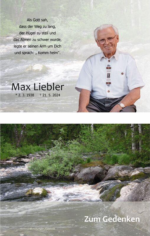Traueranzeige für Max Liebler mit Porträtfoto und Details zur Beerdigung, umgeben von einem naturnahen Hintergrund.