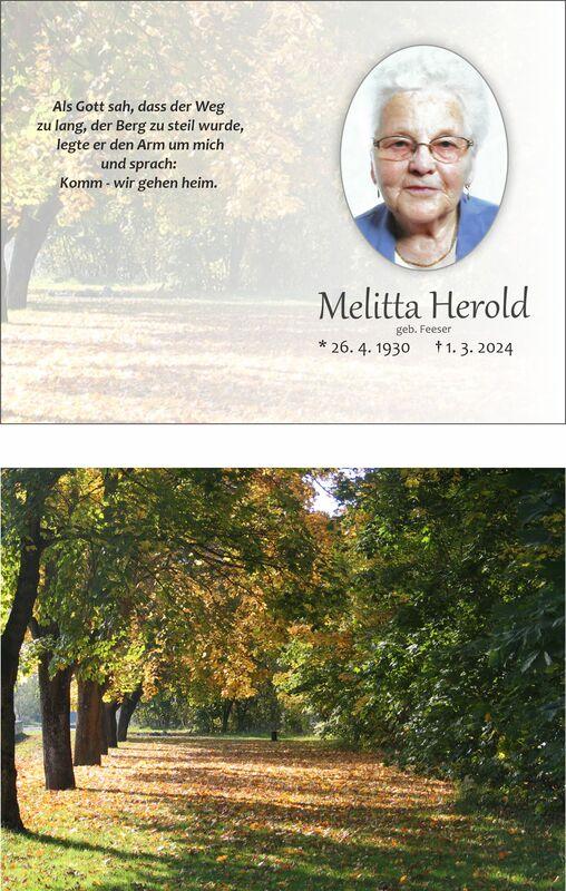 Traueranzeige für Melitta Herold, geb. Feeser, mit Lebensdaten und Beisetzungsinformationen vor herbstlicher Landschaft.