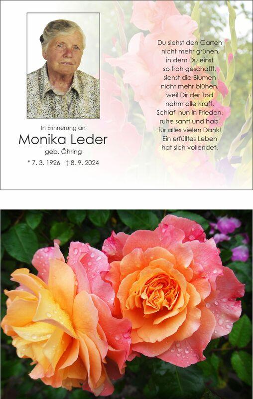 Bild mit einem Porträt von Monika Leder, umgeben von Blumen und Text zu ihrem Leben und der Trauerfeier.