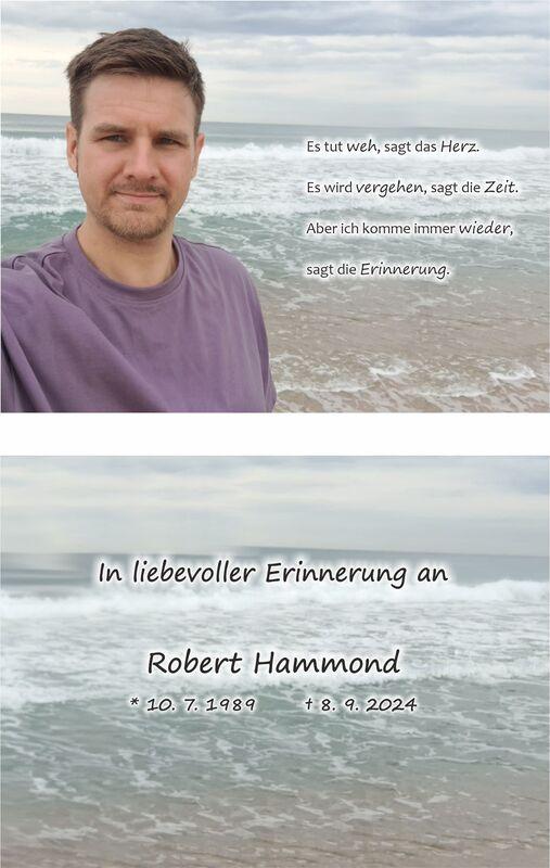 Selbstporträt eines Mannes am Strand mit den Wellen im Hintergrund und einer Gedenknotiz für Robert Hammond.