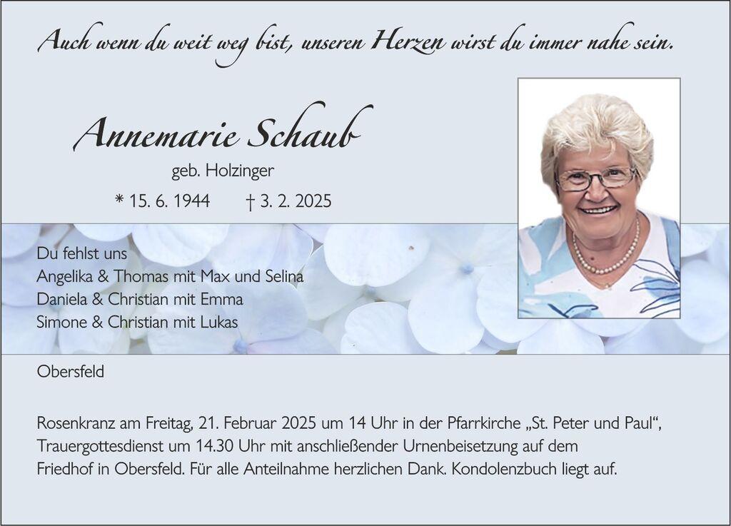 Traueranzeige für Annemarie Schaub mit Geburts- und Sterbedaten sowie Informationen zur Trauerfeier.
