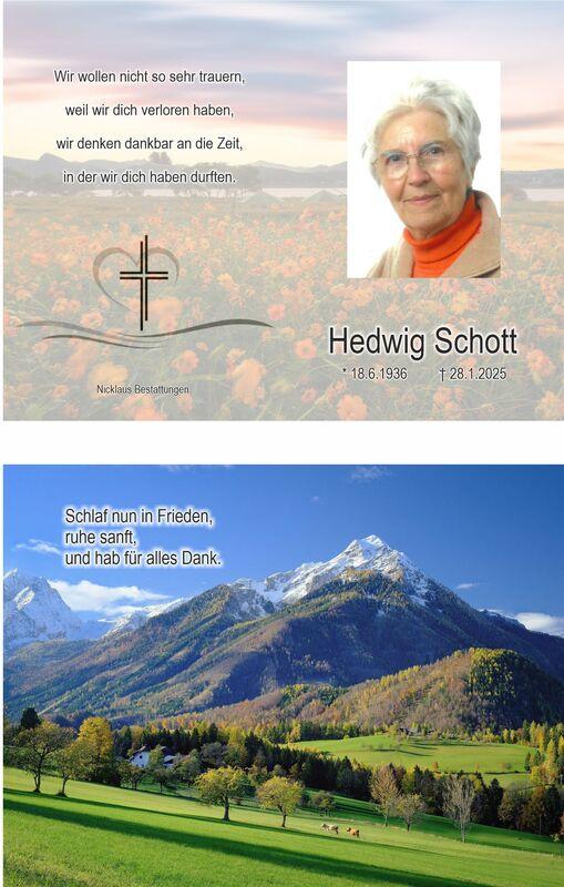 Traueranzeige für Hedwig Schott mit Datum, persönlichen Erinnerungen und Informationen zur Trauerfeier.