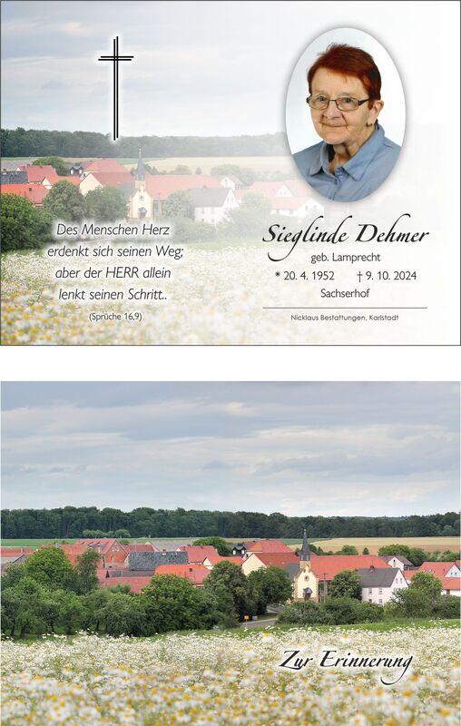 Trauerkarte mit Bild von Sieglinde Dehmer, persönlichen Daten und Informationen zur Beerdigung im Hintergrund eines ländlichen Motivs.