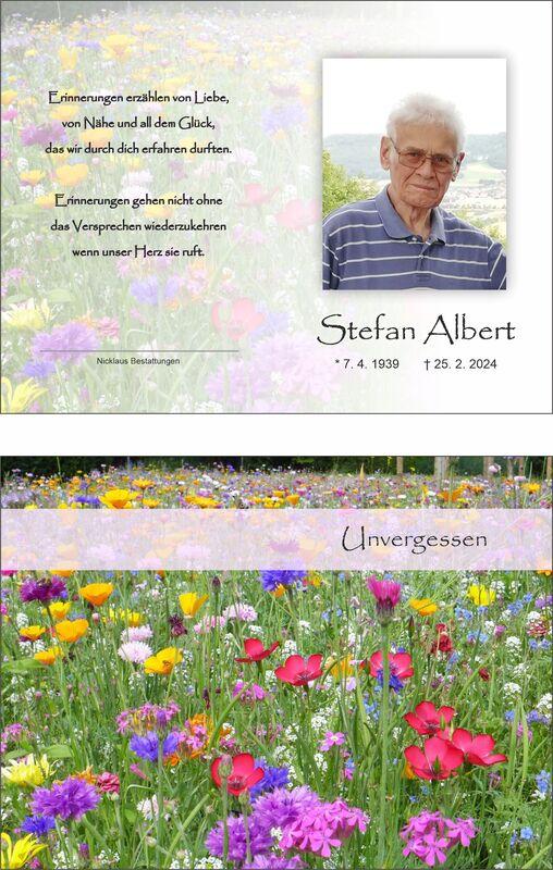 Traueranzeige für Stefan Albert mit Geburts- und Sterbedatum sowie Information zum Rosenkranz und der Urnenbeisetzung.