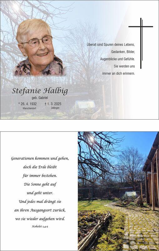 Bild von Stefanie Halbig mit persönlichen Daten und einem Garten im Hintergrund, in dem Bäume und Wege sichtbar sind.