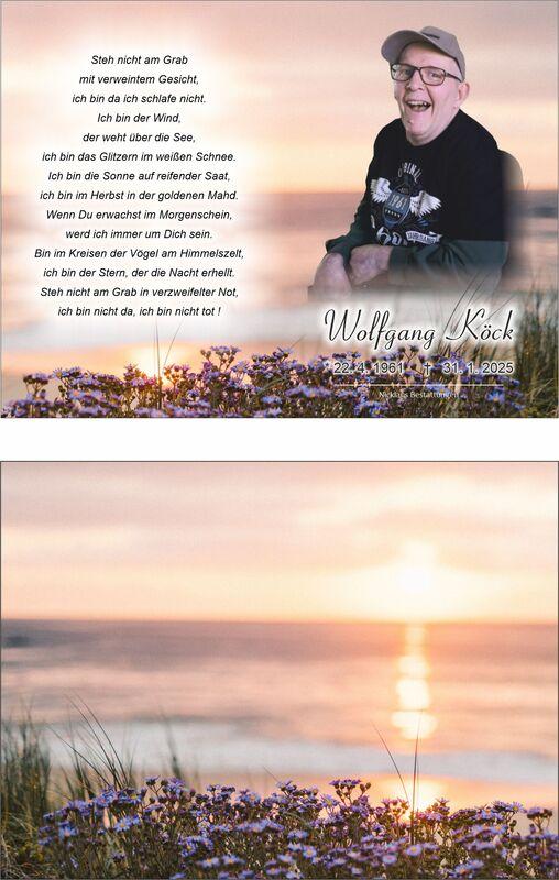 Bild mit einer Gedenkkarte für Wolfgang Köck, einschließlich Geburtstag, Sterbedatum und Beileidsbekundungen.